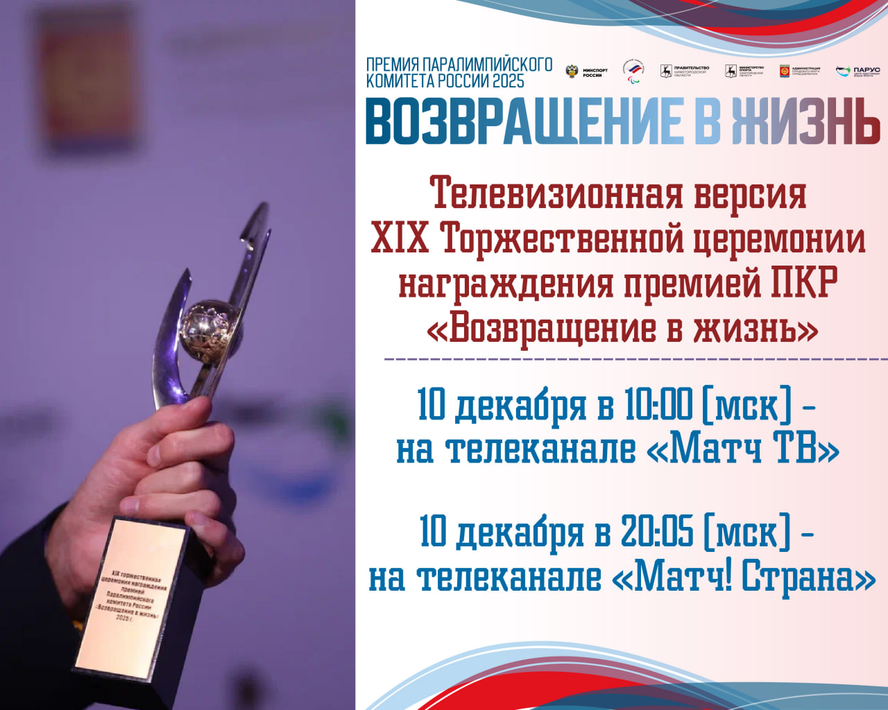 2 декабря в Дзержинске (Нижегородская область) состоялась XIX Торжественная церемония награждения премией Паралимпийского комитета России «Возвращение в жизнь».